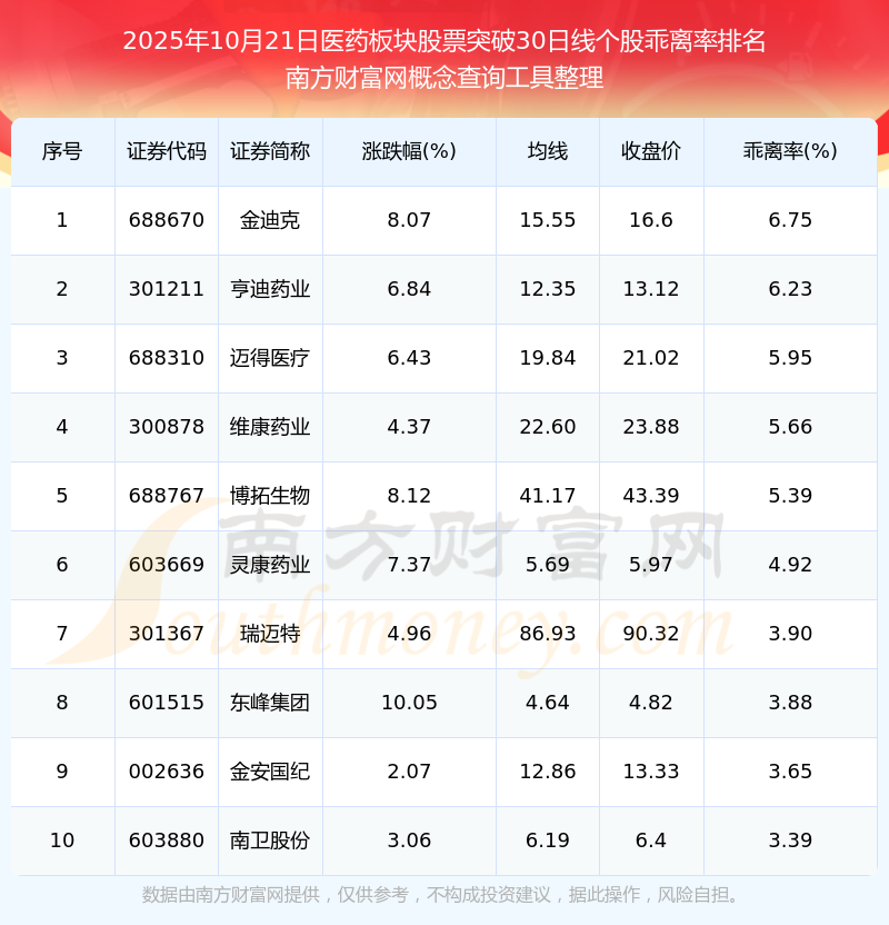 根據(jù)南方財(cái)富網(wǎng)概念查詢工具數(shù)據(jù)統(tǒng)計(jì),截止2025年10月21日收盤,醫(yī)藥板塊股票共有89只個(gè)股收盤價(jià)向上突破了30日線。其中乖離率較大的個(gè)股有金迪克、亨迪藥業(yè)、邁得醫(yī)療等,乖離率分別為6.75%、6.23%、5.95%。