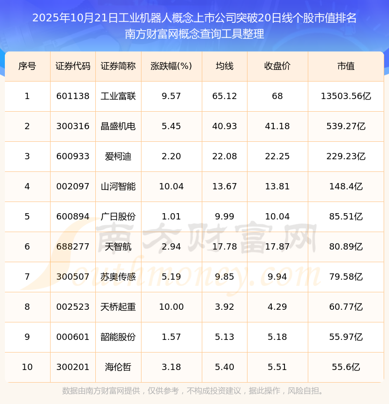 2025年10月21日工業(yè)機器人概念上市公司突破20日線個股市值排名