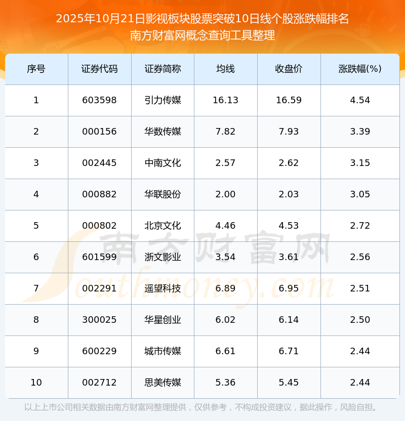 2025年10月21日影視板塊股票突破10日線個(gè)股漲跌幅排名