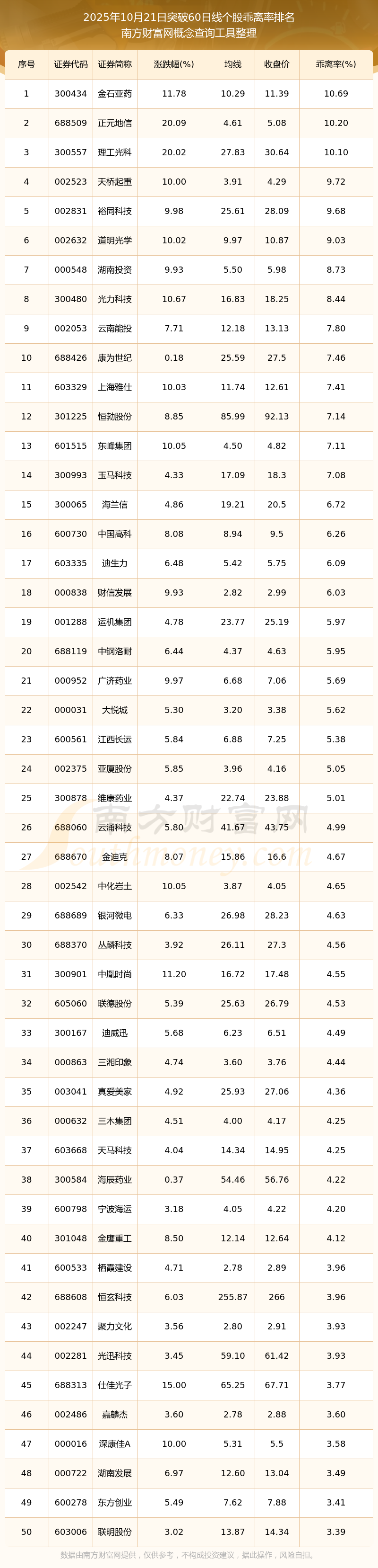 2025年10月21日突破60日線個(gè)股乖離率排名