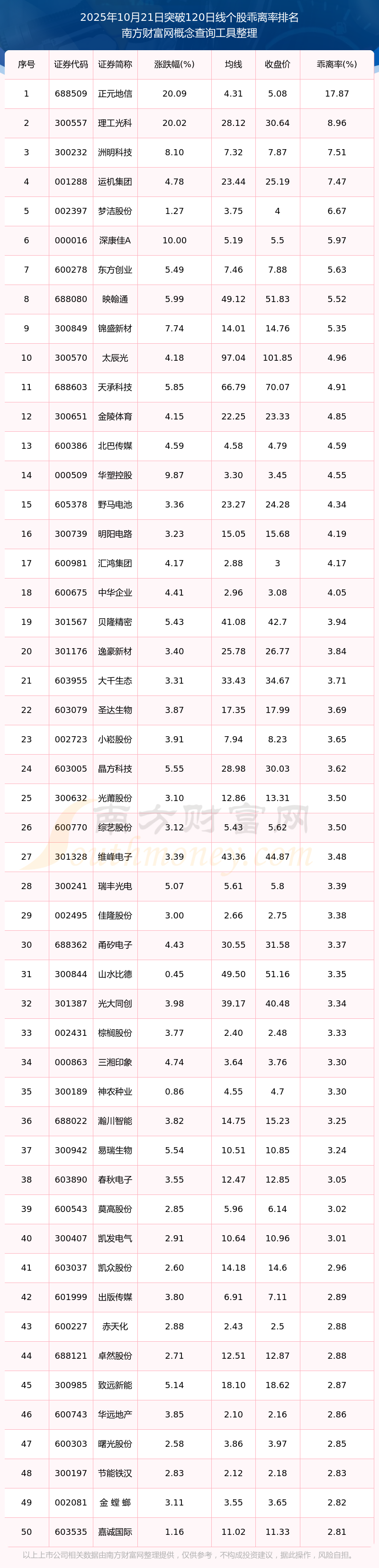根據(jù)南方財富網(wǎng)概念查詢工具數(shù)據(jù)統(tǒng)計,截止2025年10月21日收盤,共有411只個股收盤價向上突破了半年線,其中乖離率較大的個股有正元地信、理工光科、洲明科技、運機集團、夢潔股份等,乖離率分別為17.87%、8.96%、7.51%、7.47%、6.67%。