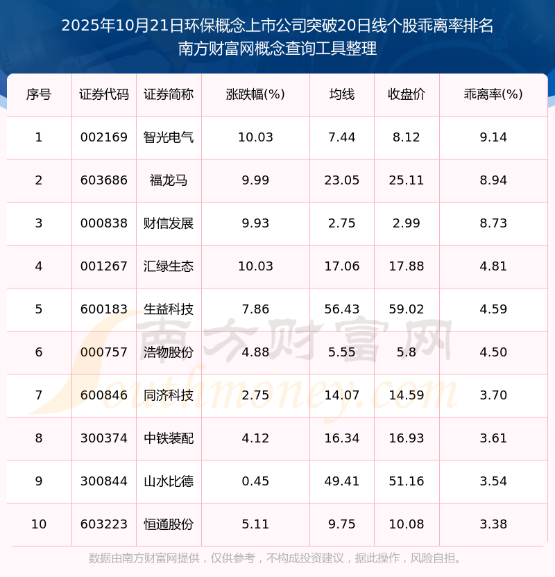 根據(jù)南方財富網(wǎng)概念查詢工具數(shù)據(jù)統(tǒng)計,截止2025年10月21日收盤,環(huán)保概念上市公司共有80只個股收盤價向上突破了20日線。其中乖離率較大的個股有智光電氣、福龍馬、財信發(fā)展等,乖離率分別為9.14%、8.94%、8.73%。