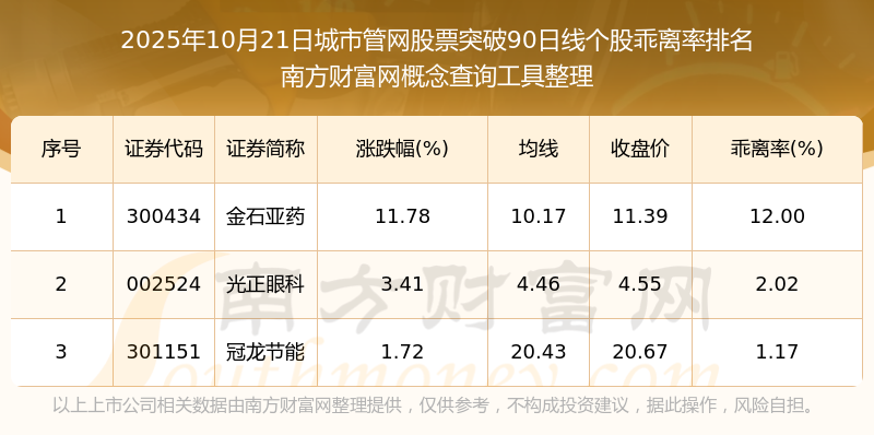 2025年10月21日城市管網(wǎng)股票突破90日線個(gè)股乖離率排名