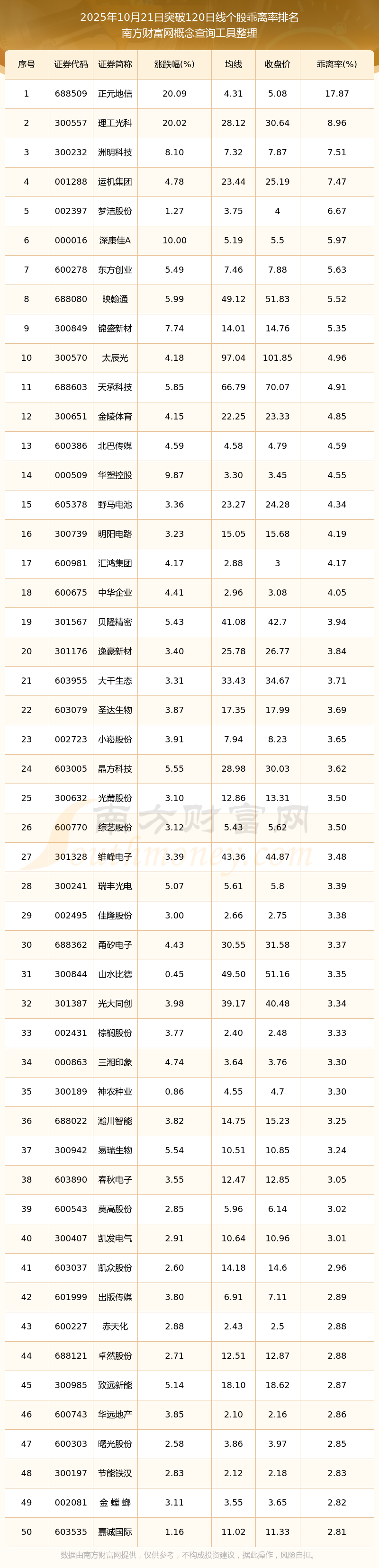 2025年10月21日突破120日線個(gè)股乖離率排名