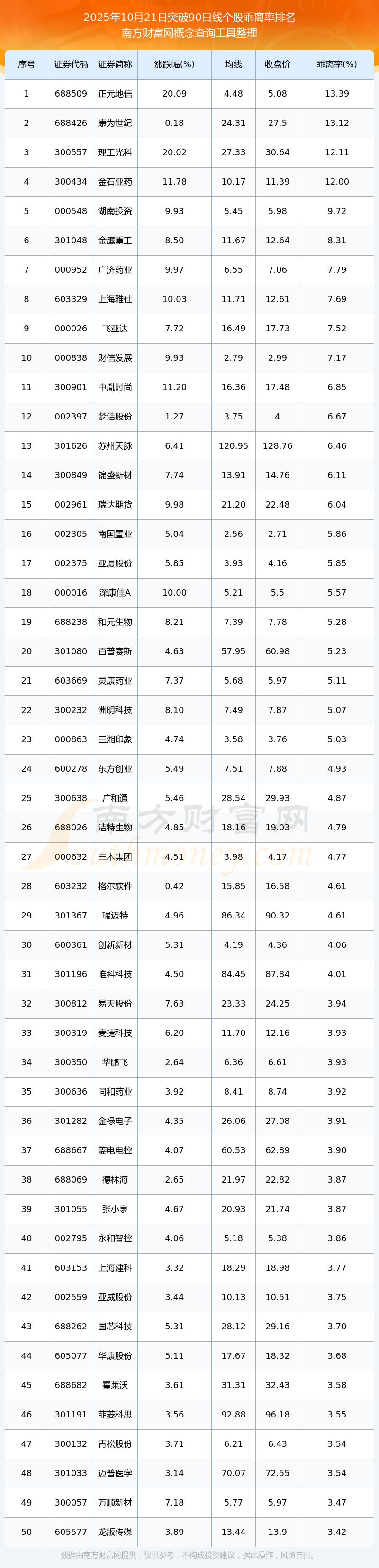 2025年10月21日突破90日線個(gè)股乖離率排名