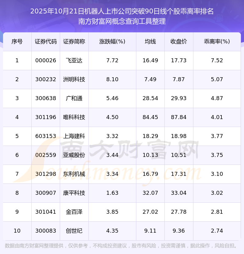根據(jù)南方財富網(wǎng)概念查詢工具數(shù)據(jù)統(tǒng)計,截止2025年10月21日收盤,機器人上市公司共有66只個股收盤價向上突破了90日線。其中乖離率較大的個股有飛亞達、洲明科技、廣和通等,乖離率分別為7.52%、5.07%、4.87%。