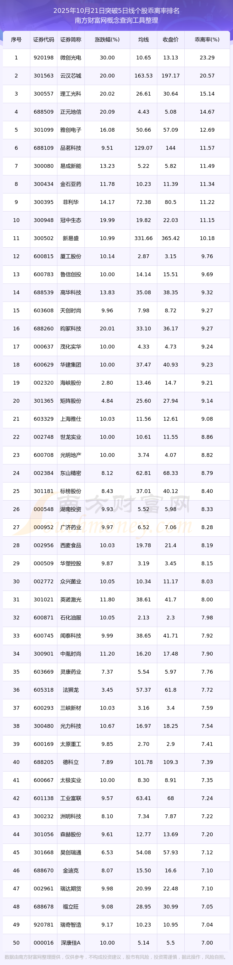根據(jù)南方財富網(wǎng)概念查詢工具數(shù)據(jù)統(tǒng)計,截止2025年10月21日收盤,共有2786只個股收盤價向上突破了5日線,其中乖離率較大的個股有微創(chuàng)光電、云漢芯城、理工光科、正元地信、雅創(chuàng)電子等,乖離率分別為23.29%、20.57%、15.14%、14.67%、12.69%。