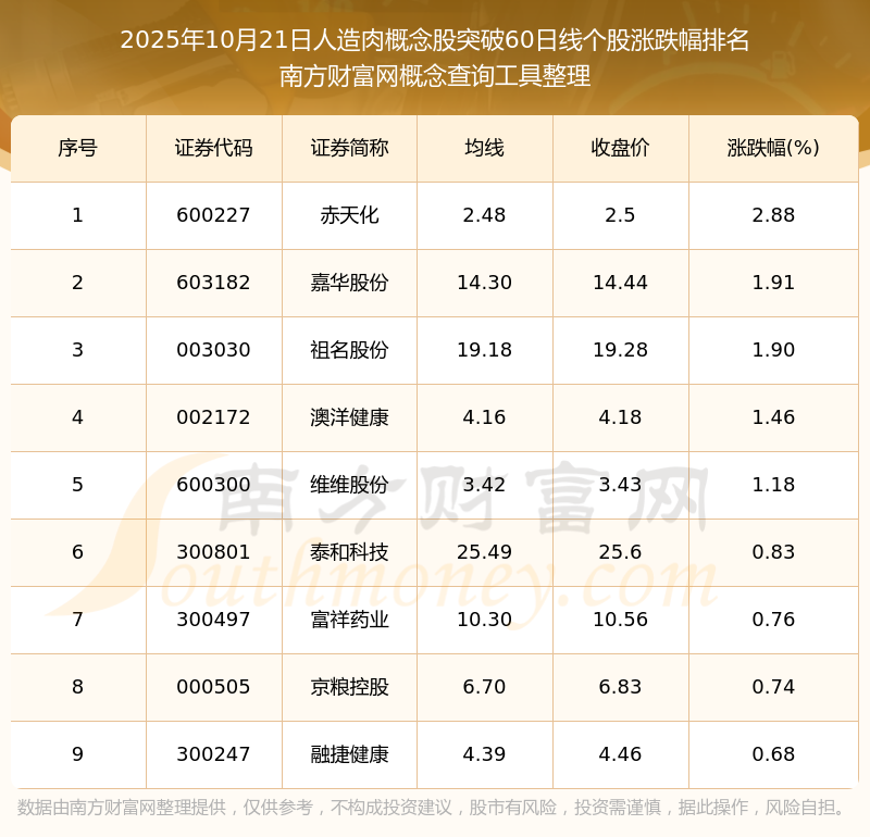 2025年10月21日人造肉概念股突破60日線個(gè)股漲跌幅排名