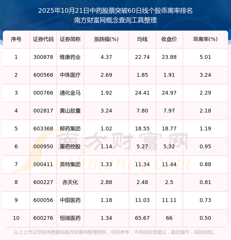 根據(jù)南方財富網(wǎng)概念查詢工具數(shù)據(jù)統(tǒng)計,截止2025年10月21日收盤,中藥股票共有15只個股收盤價向上突破了60日線。其中乖離率較大的個股有維康藥業(yè)、中珠醫(yī)療、通化金馬等,乖離率分別為5.01%、3.24%、2.29%。