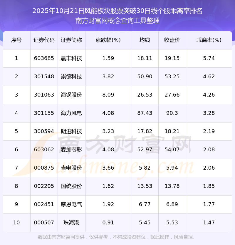 2025年10月21日風(fēng)能板塊股票突破30日線個股乖離率排名