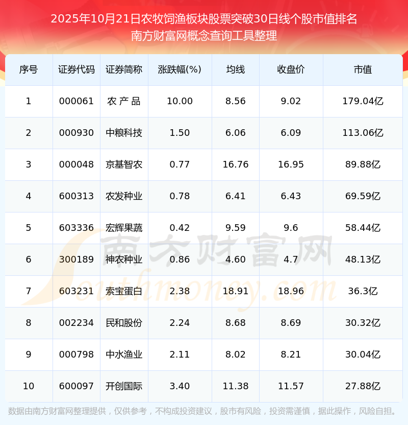 2025年10月21日農(nóng)牧飼漁板塊股票突破30日線個股市值排名