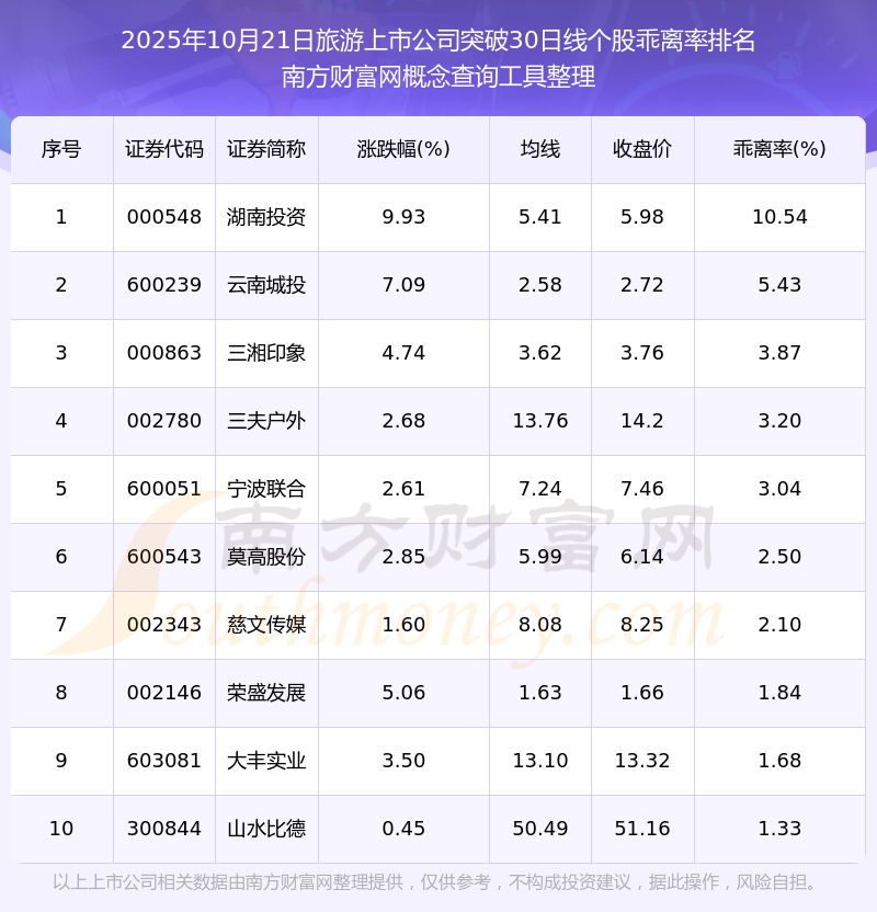 根據(jù)南方財富網(wǎng)概念查詢工具數(shù)據(jù)統(tǒng)計,截止2025年10月21日收盤,旅游上市公司共有20只個股收盤價向上突破了30日線。其中乖離率較大的個股有湖南投資、云南城投、三湘印象等,乖離率分別為10.54%、5.43%、3.87%。