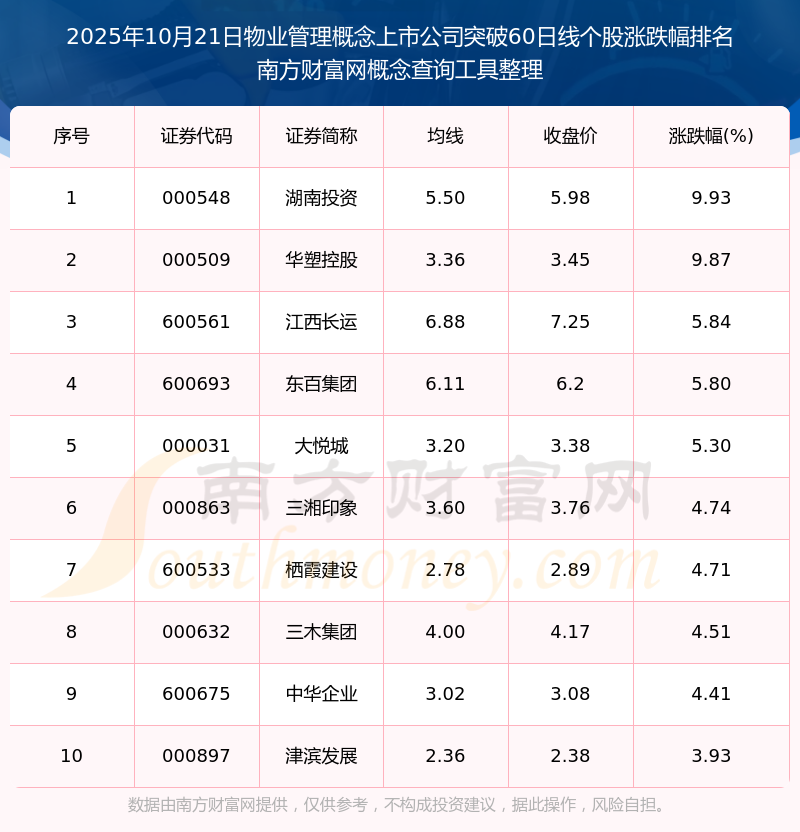 2025年10月21日物業(yè)管理概念上市公司突破60日線個(gè)股漲跌幅排名
