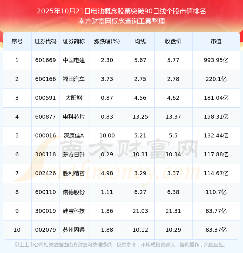 2025年10月21日電池概念股票突破90日線個(gè)股市值排名