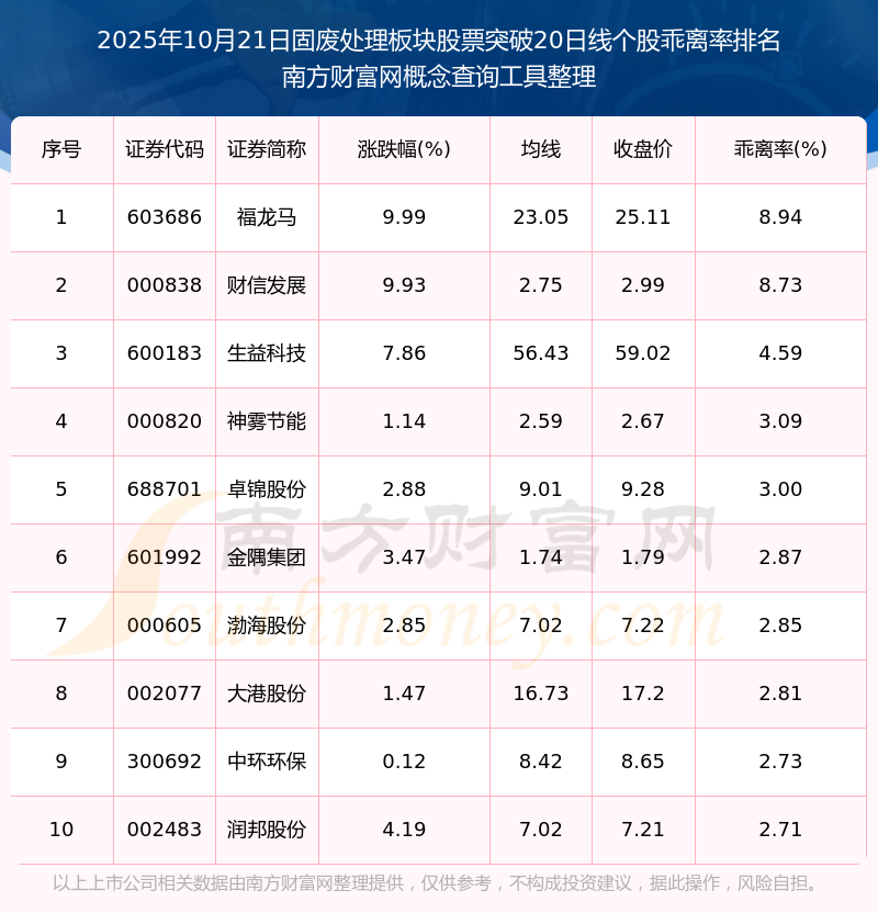 2025年10月21日固廢處理板塊股票突破20日線個股乖離率排名