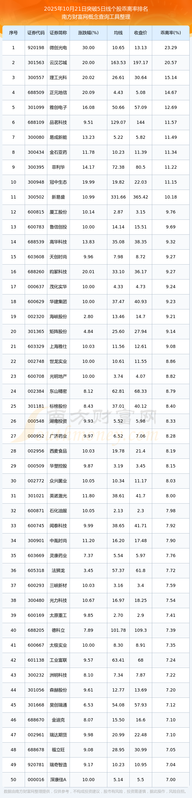 根據(jù)南方財(cái)富網(wǎng)概念查詢工具數(shù)據(jù)統(tǒng)計(jì),截止2025年10月21日收盤,共有2786只個股收盤價向上突破了5日線,其中乖離率較大的個股有微創(chuàng)光電、云漢芯城、理工光科、正元地信、雅創(chuàng)電子等,乖離率分別為23.29%、20.57%、15.14%、14.67%、12.69%。