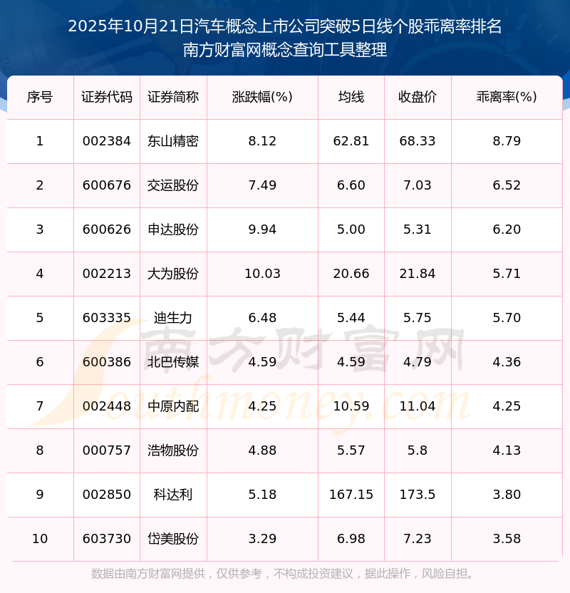 2025年10月21日汽車概念上市公司突破5日線個股乖離率排名