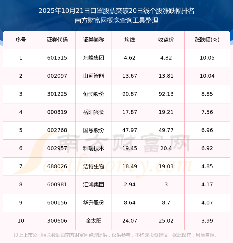 2025年10月21日口罩股票突破20日線個(gè)股漲跌幅排名