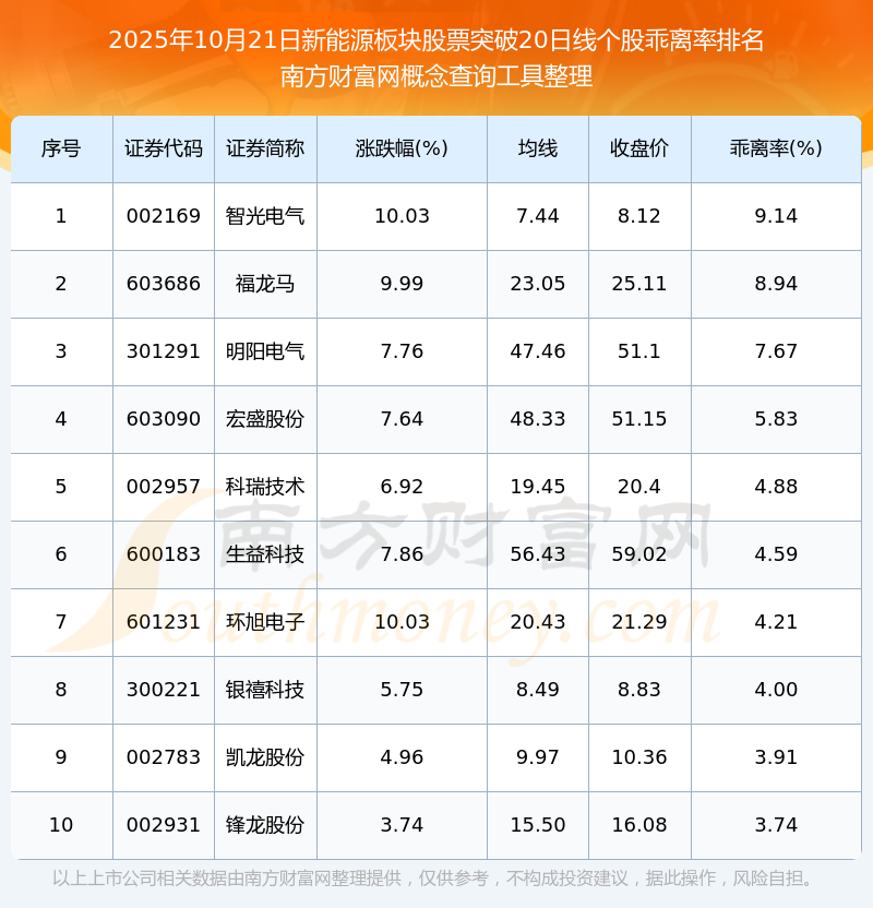 根據(jù)南方財(cái)富網(wǎng)概念查詢工具數(shù)據(jù)統(tǒng)計(jì),截止2025年10月21日收盤,新能源板塊股票共有130只個(gè)股收盤價(jià)向上突破了20日線。其中乖離率較大的個(gè)股有智光電氣、福龍馬、明陽電氣等,乖離率分別為9.14%、8.94%、7.67%。