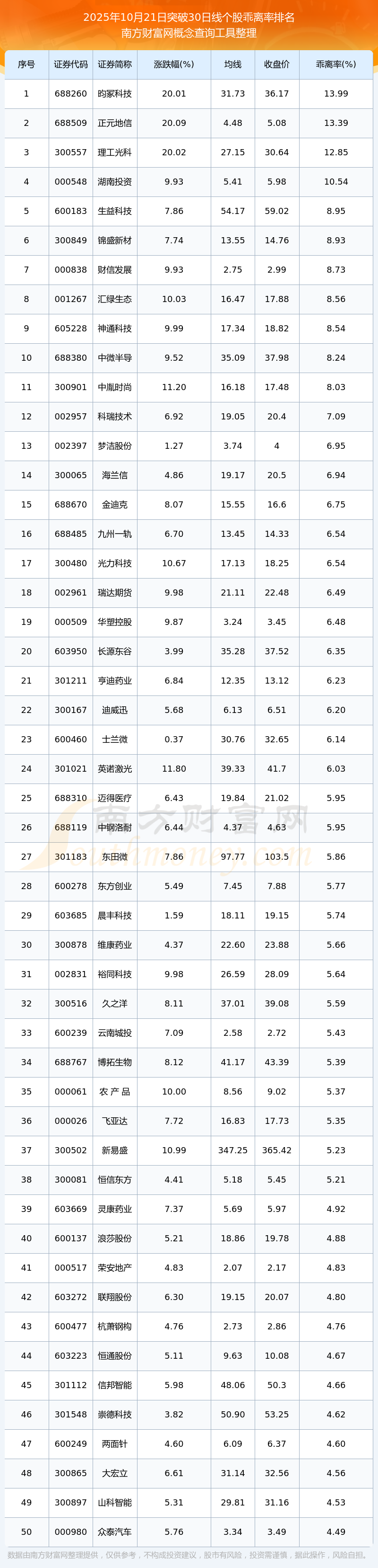 根據(jù)南方財富網(wǎng)概念查詢工具數(shù)據(jù)統(tǒng)計,截止2025年10月21日收盤,共有729只個股收盤價向上突破了30日線,其中乖離率較大的個股有昀?萍、正元地信、理工光科、湖南投資、生益科技等,乖離率分別為13.99%、13.39%、12.85%、10.54%、8.95%。
