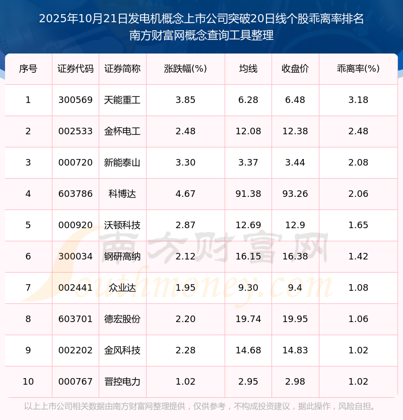 2025年10月21日發(fā)電機(jī)概念上市公司突破20日線個(gè)股乖離率排名