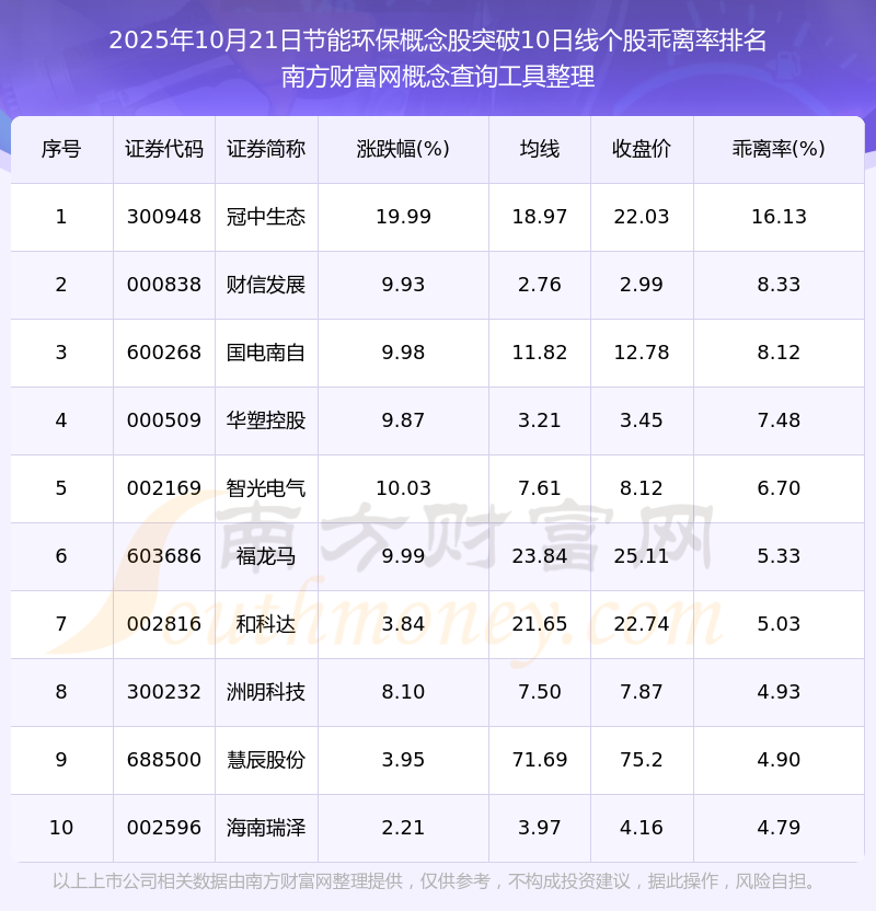2025年10月21日節(jié)能環(huán)保概念股突破10日線個(gè)股乖離率排名