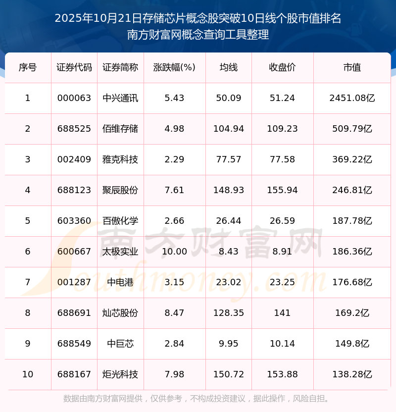 2025年10月21日存儲(chǔ)芯片概念股突破10日線個(gè)股市值排名
