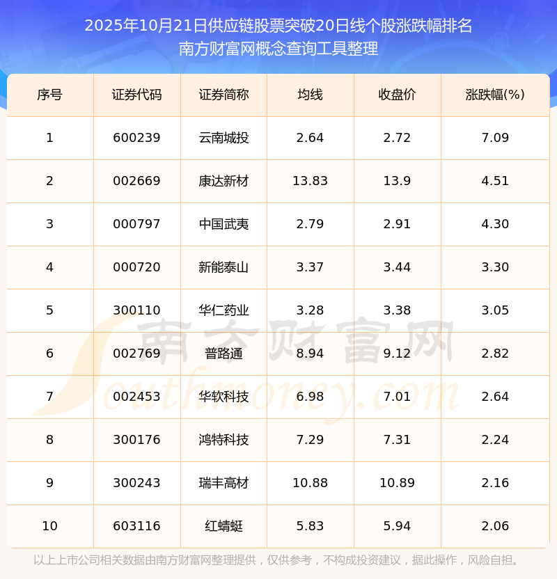 根據(jù)南方財(cái)富網(wǎng)概念查詢(xún)工具數(shù)據(jù)統(tǒng)計(jì),截止2025年10月21日收盤(pán),供應(yīng)鏈股票共有18只個(gè)股收盤(pán)價(jià)向上突破了20日線(xiàn)。其中漲幅較大的個(gè)股有云南城投、康達(dá)新材、中國(guó)武夷等,漲幅分別為7.09%、4.51%、4.30%。