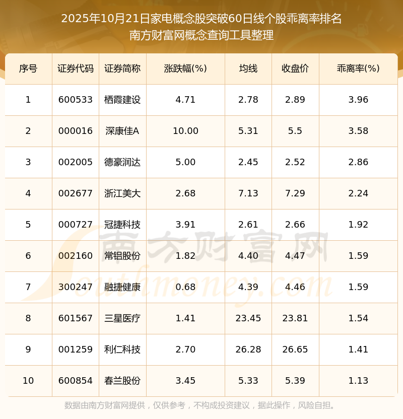 2025年10月21日家電概念股突破60日線個(gè)股乖離率排名