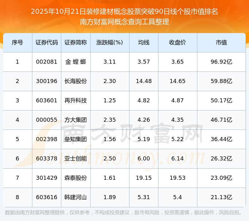 2025年10月21日裝修建材概念股票突破90日線個(gè)股市值排名