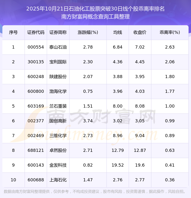 2025年10月21日石油化工股票突破30日線個(gè)股乖離率排名