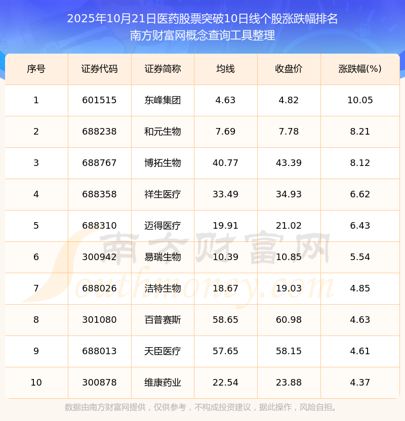 根據(jù)南方財富網(wǎng)概念查詢工具數(shù)據(jù)統(tǒng)計,截止2025年10月21日收盤,醫(yī)藥股票共有131只個股收盤價向上突破了10日線。其中漲幅較大的個股有東峰集團(tuán)、和元生物、博拓生物等,漲幅分別為10.05%、8.21%、8.12%。