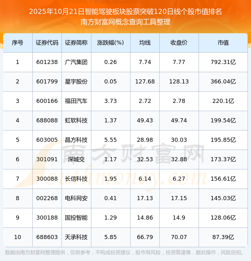 2025年10月21日智能駕駛板塊股票突破120日線個(gè)股市值排名