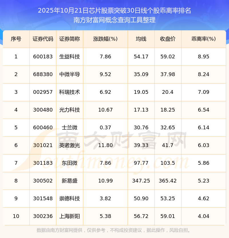2025年10月21日芯片股票突破30日線個(gè)股乖離率排名
