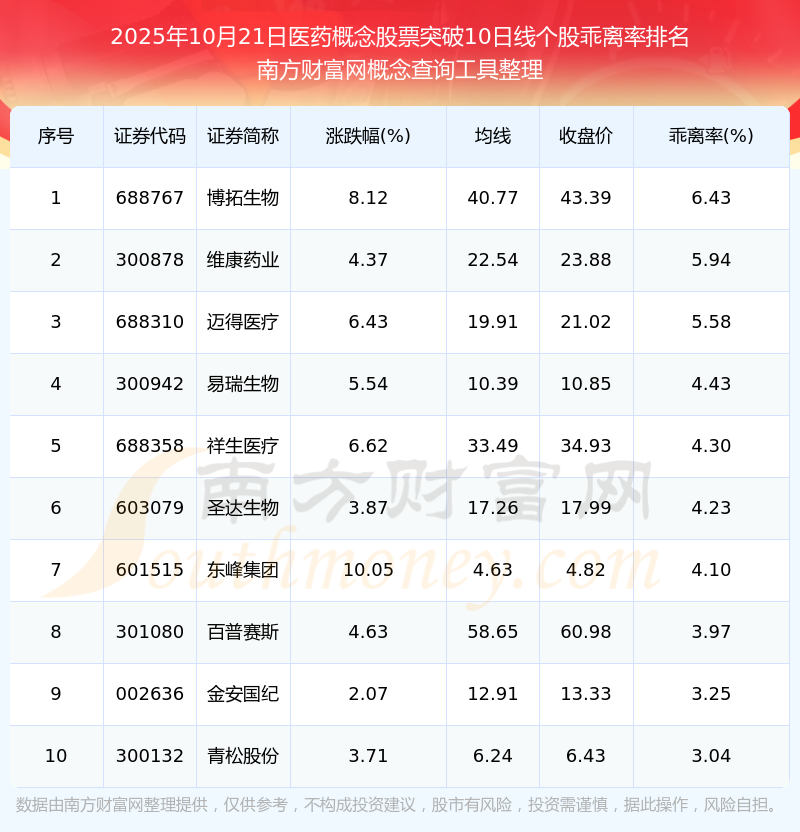 2025年10月21日醫(yī)藥概念股票突破10日線個股乖離率排名