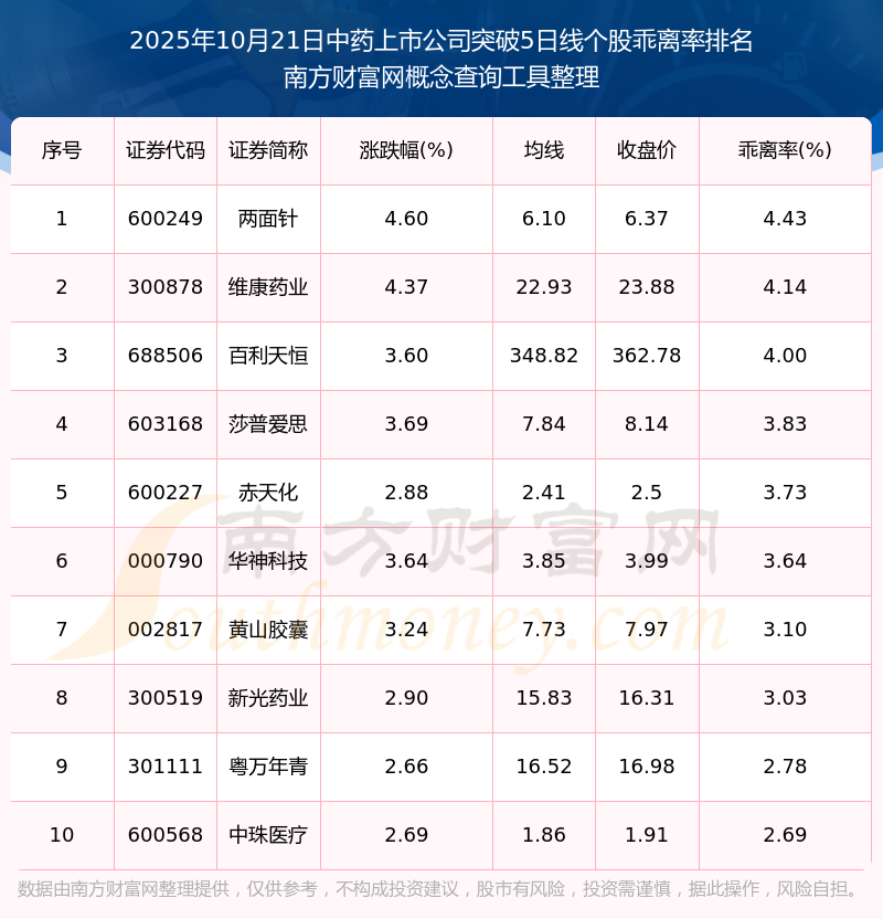 2025年10月21日中藥上市公司突破5日線個(gè)股乖離率排名