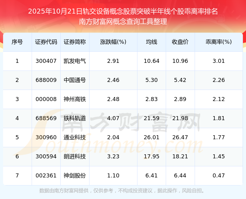 2025年10月21日軌交設(shè)備概念股票突破半年線個(gè)股乖離率排名