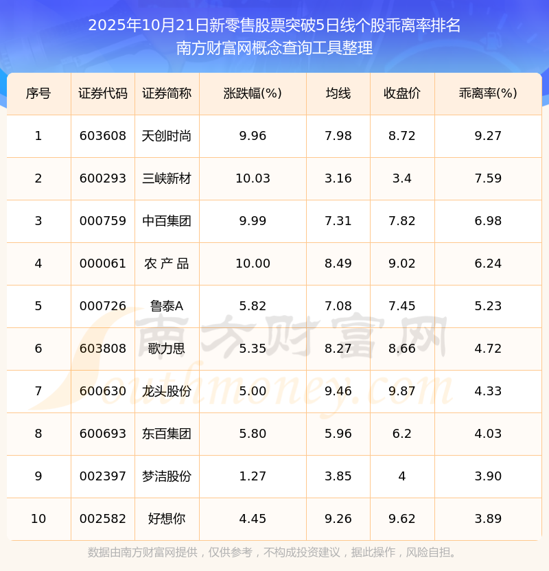 根據(jù)南方財富網(wǎng)概念查詢工具數(shù)據(jù)統(tǒng)計,截止2025年10月21日收盤,新零售股票共有124只個股收盤價向上突破了5日線。其中乖離率較大的個股有天創(chuàng)時尚、三峽新材、中百集團等,乖離率分別為9.27%、7.59%、6.98%。