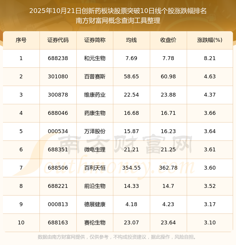 2025年10月21日創(chuàng)新藥板塊股票突破10日線個(gè)股漲跌幅排名