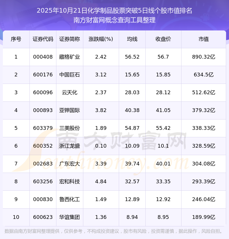 2025年10月21日化學(xué)制品股票突破5日線個股市值排名