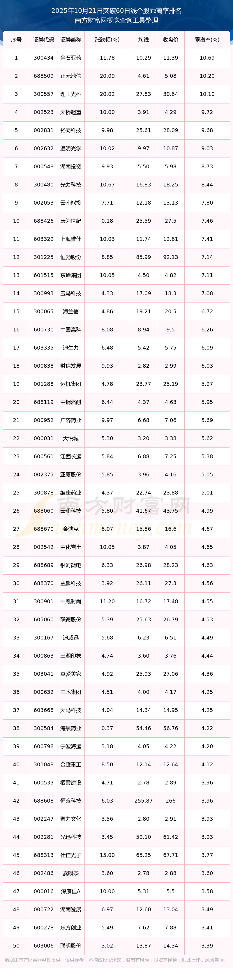 2025年10月21日突破60日線個(gè)股乖離率排名