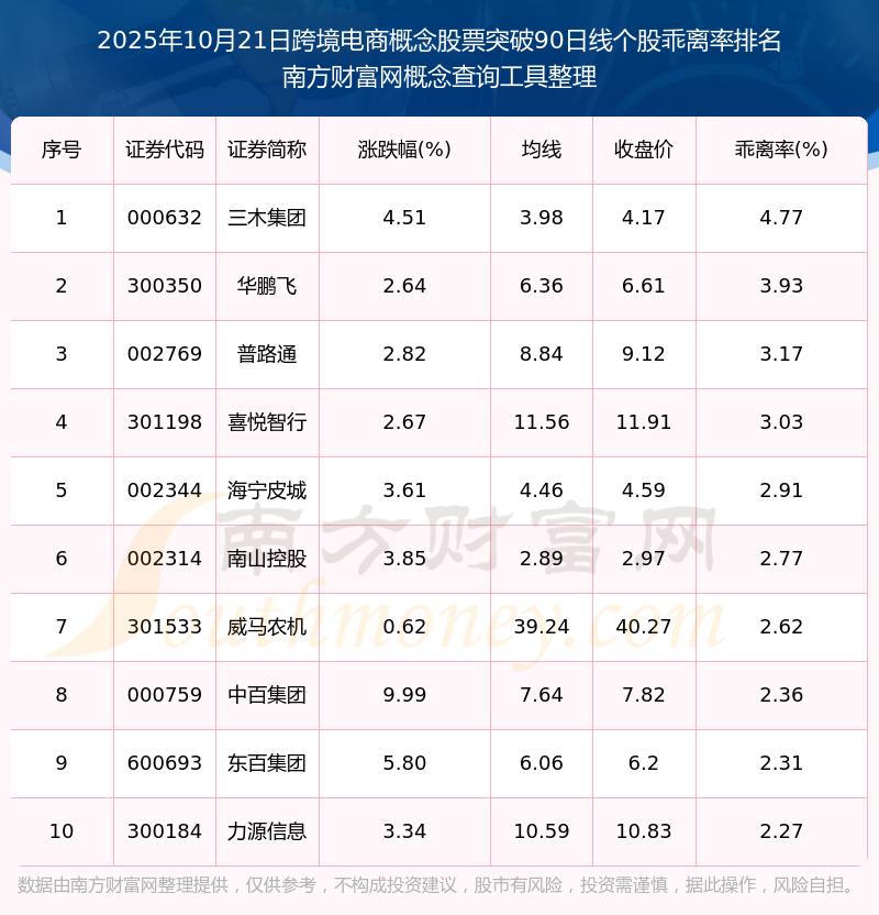 2025年10月21日跨境電商概念股票突破90日線個股乖離率排名