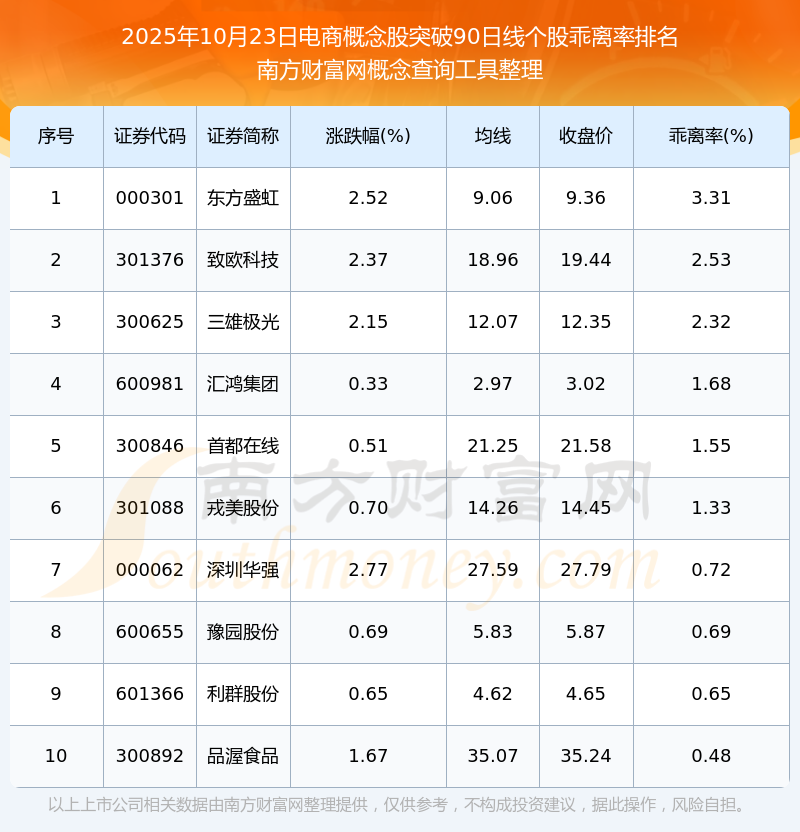 2025年10月23日電商概念股突破90日線個(gè)股乖離率排名