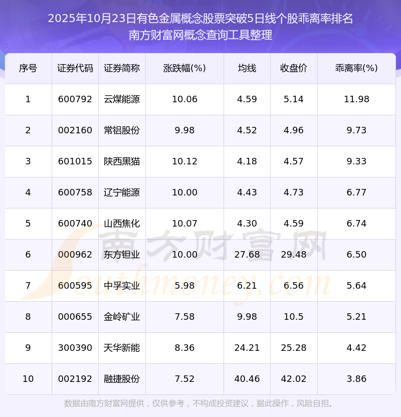 2025年10月23日有色金屬概念股票突破5日線個(gè)股乖離率排名