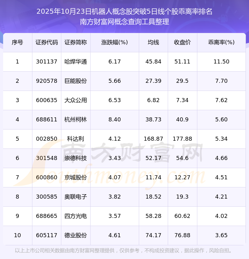 根據(jù)南方財富網(wǎng)概念查詢工具數(shù)據(jù)統(tǒng)計,截止2025年10月23日收盤,機器人概念股共有176只個股收盤價向上突破了5日線。其中乖離率較大的個股有哈焊華通、巨能股份、大眾公用等,乖離率分別為11.50%、7.70%、7.62%。