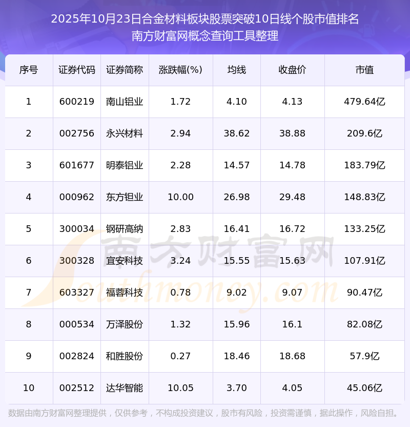 2025年10月23日合金材料板塊股票突破10日線個股市值排名
