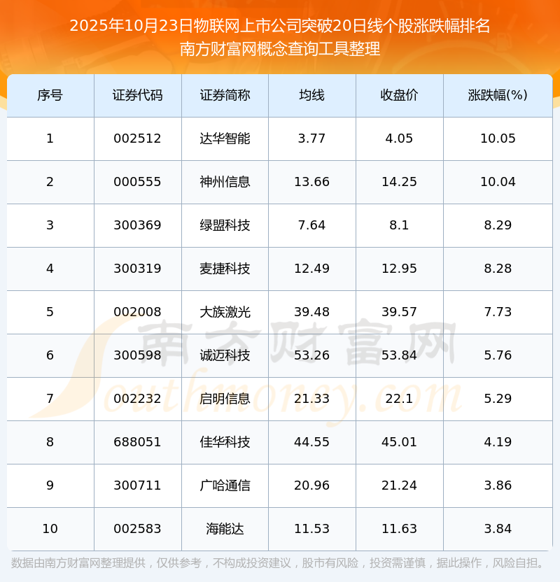 2025年10月23日物聯(lián)網(wǎng)上市公司突破20日線個股漲跌幅排名