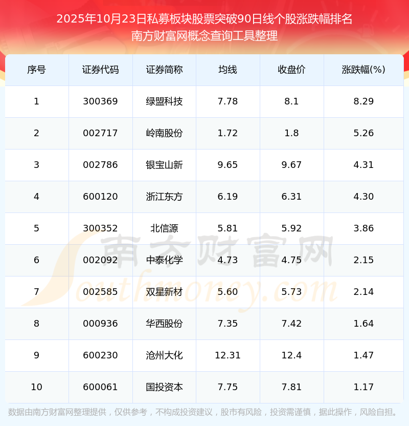 2025年10月23日私募板塊股票突破90日線個(gè)股漲跌幅排名