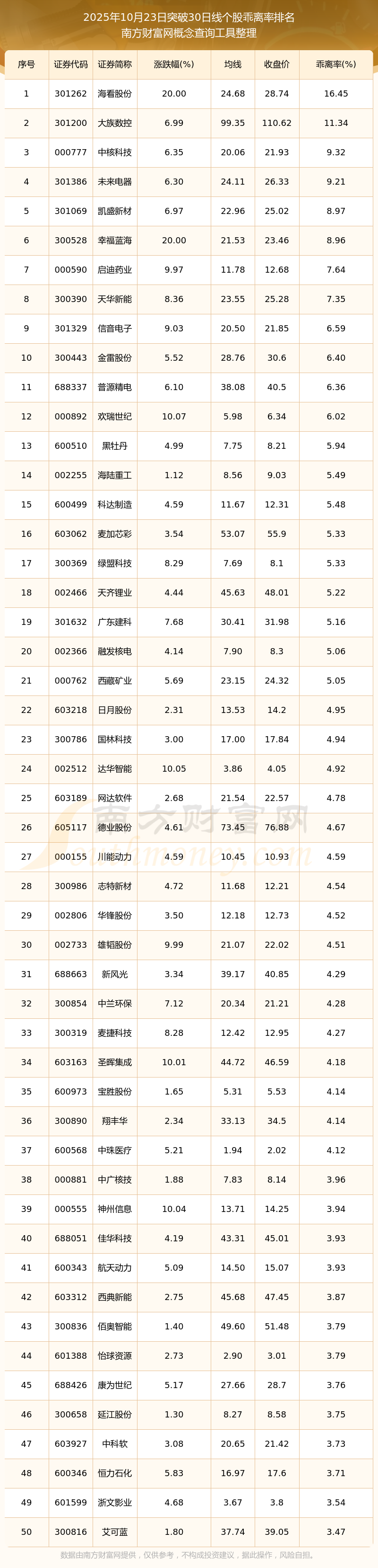 2025年10月23日突破30日線個(gè)股乖離率排名