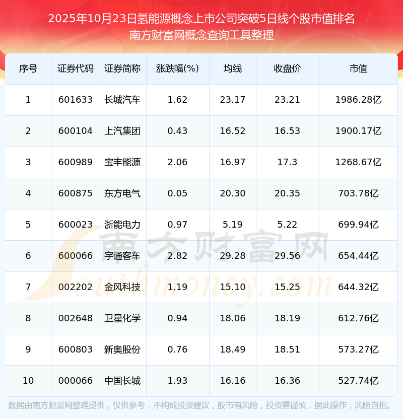 2025年10月23日氫能源概念上市公司突破5日線個(gè)股市值排名